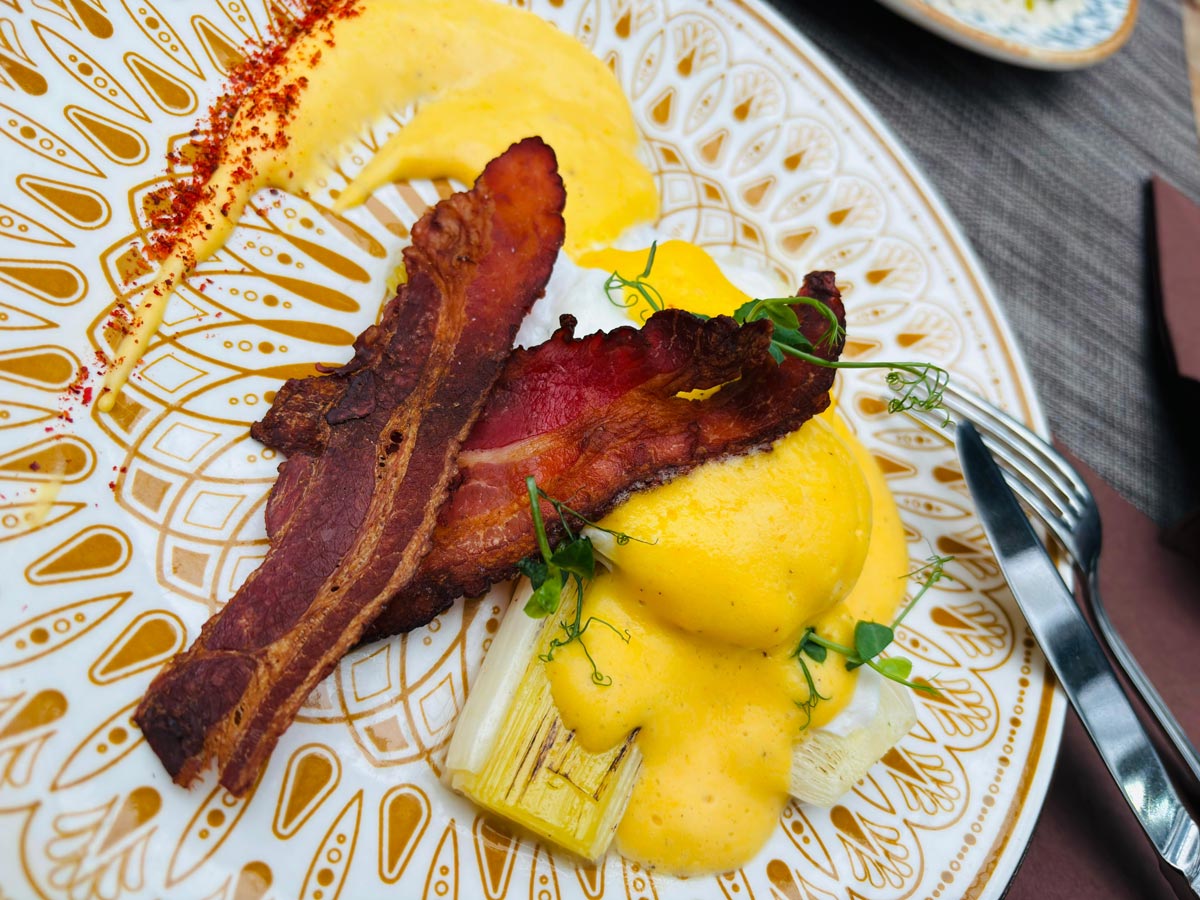 Poached egg, tender leeks, crispy bacon chips, mousseline sauce and herb oil