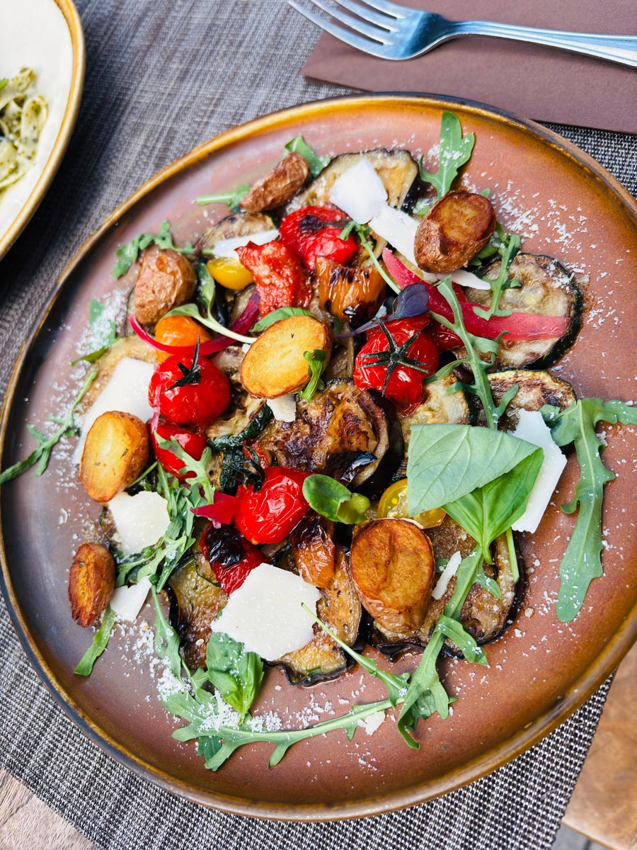 Carpaccio de légumes grillés et confits, roquette et parmesan, servi avec des pommes de terre