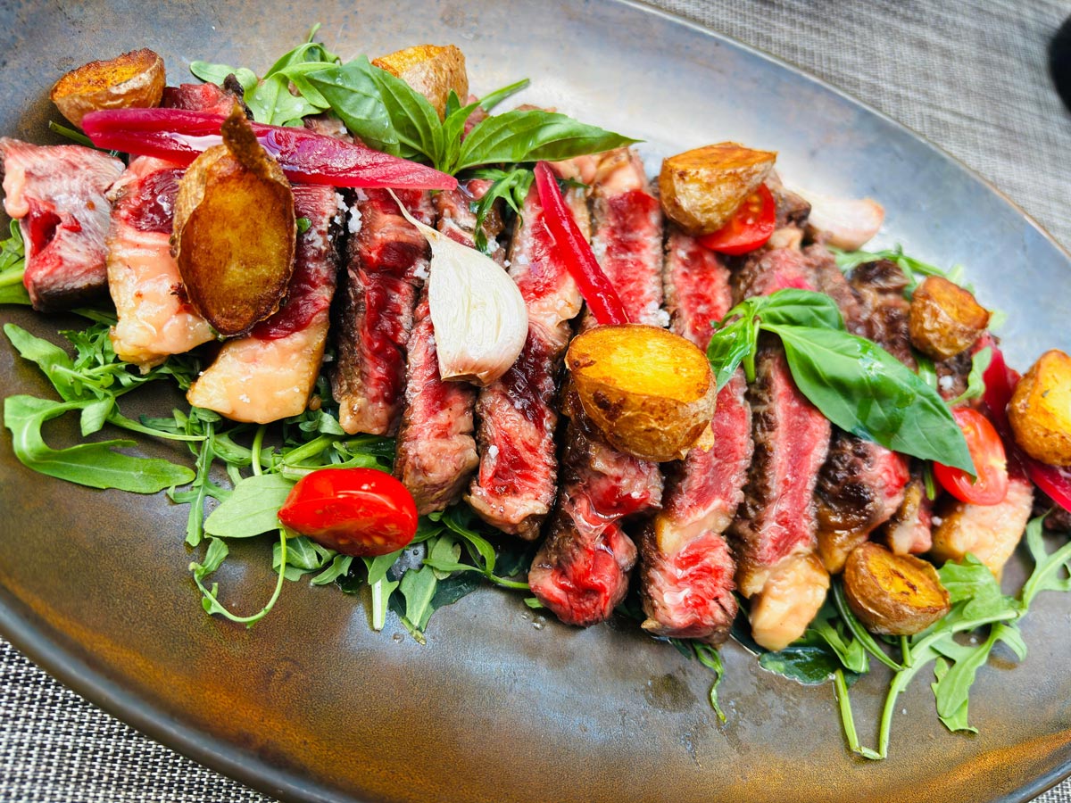 Tagliatelles de bœuf (cuisson au choix), roquette, basilic, parmesan, ail rôti et tomates cerises, accompagnées de pommes grenailles