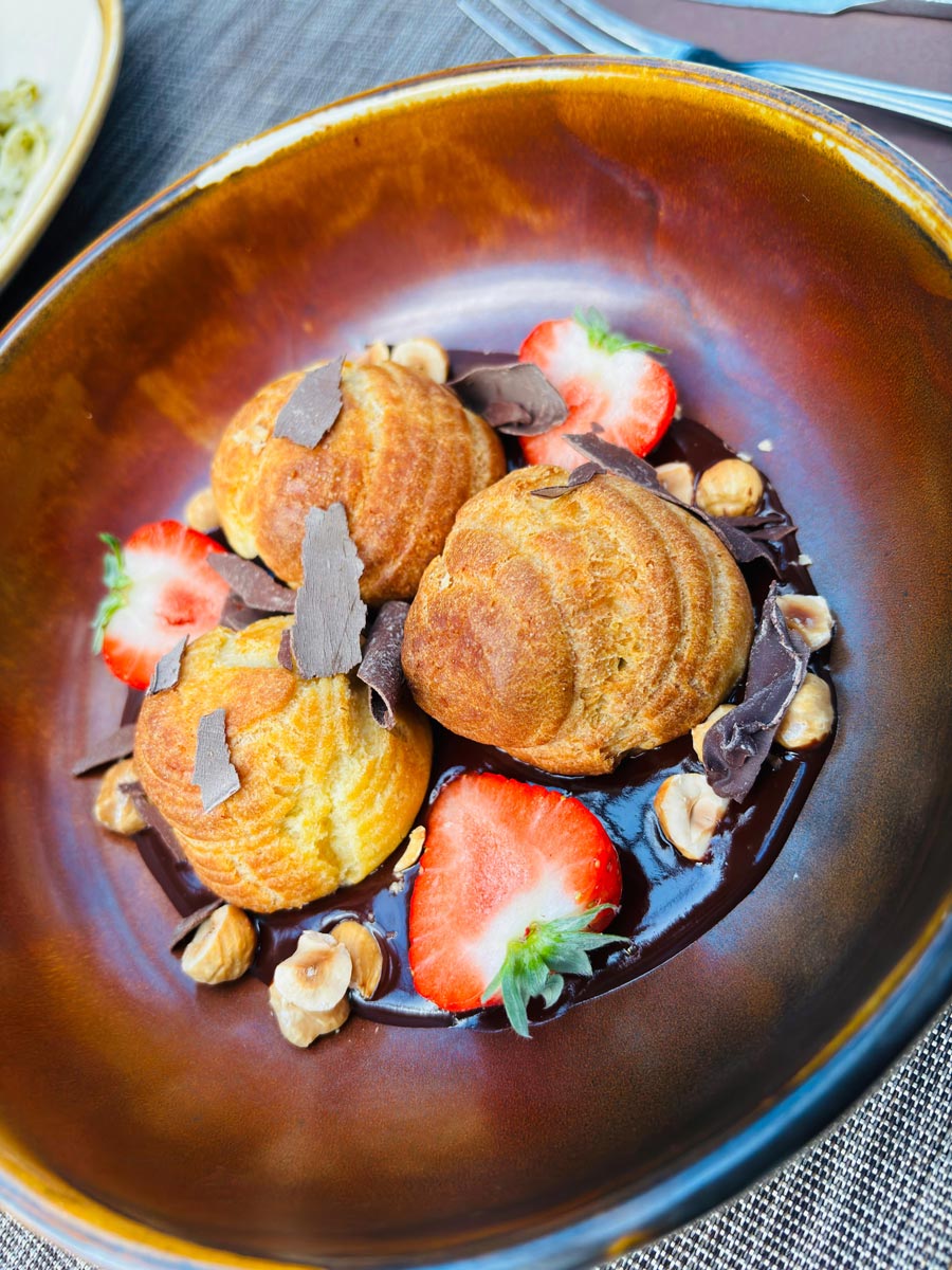 Gevulde kool met mokka banketbakkersroom en warme chocoladesaus