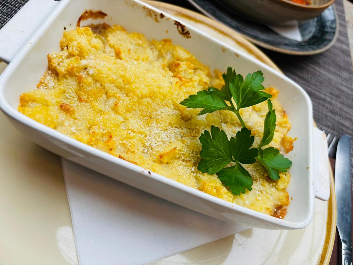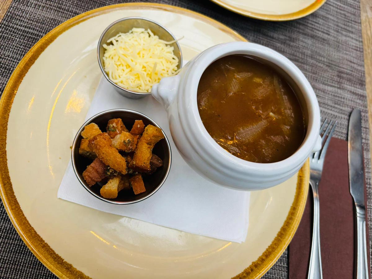 Soupe à l’oignon gratinée, fromage râpé et croûtons