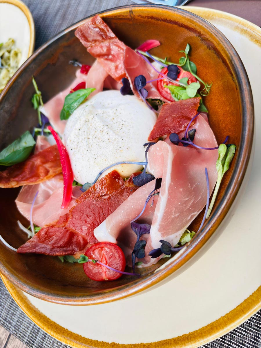 Burrata crémeuse, jambon italien, roquette et chips de jambon