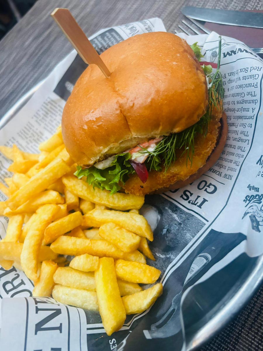 Burger de scampis panés, potato buns, pickles de concombre, coleslaw et sauce au yaourt