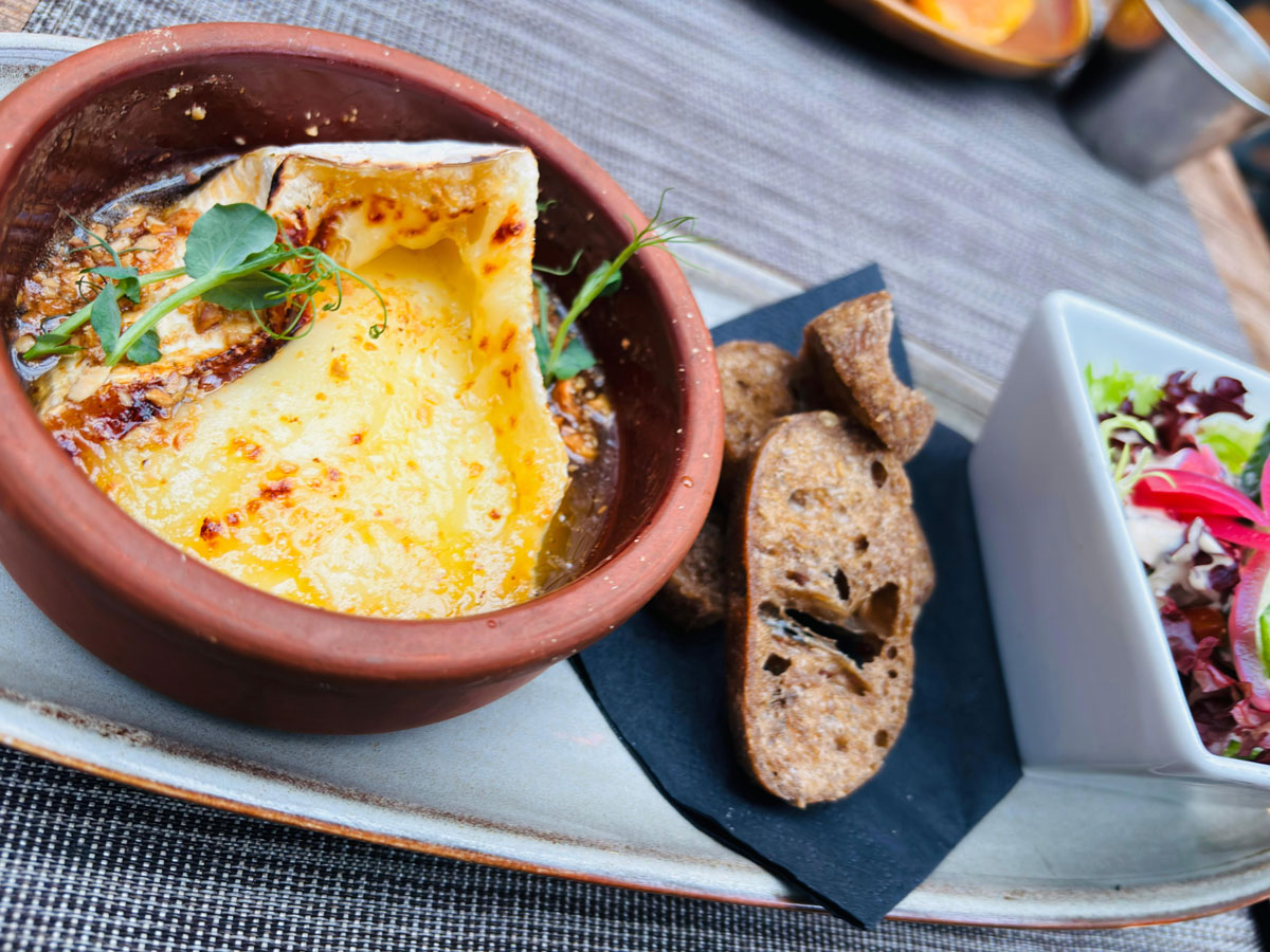 Baked brie with honey, roasted hazelnuts, toast and green salad