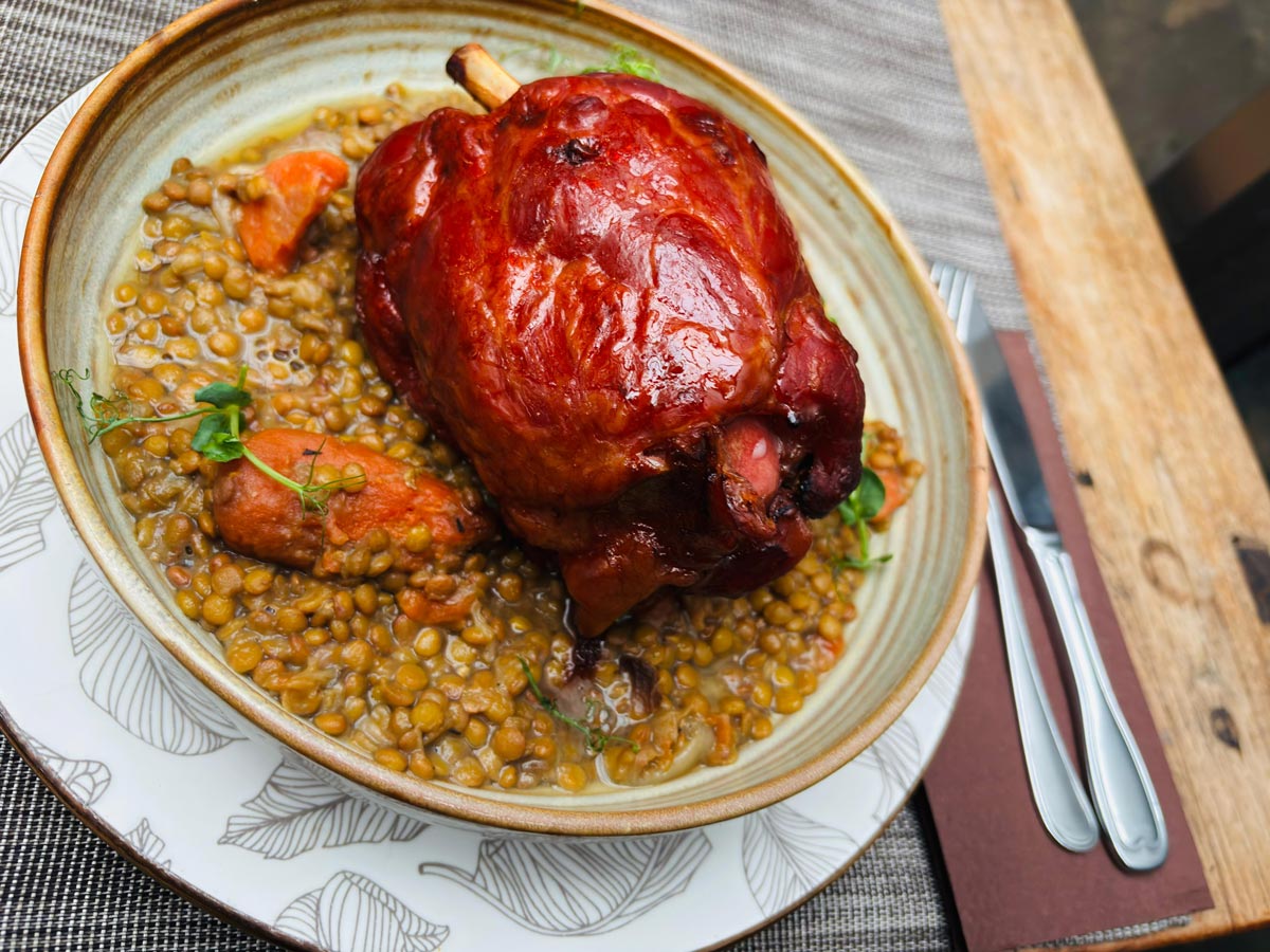 Caramelized pork knuckle with lentils, cooked in lard and pork rind